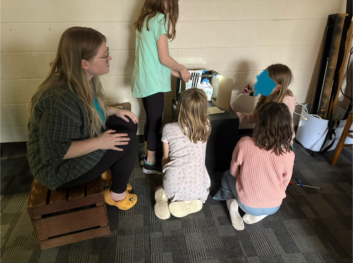 A favorite English teacher of mine once defined an essay as “an exploration,” and it changed the way I approached both learning and teaching from that point forward. As a teaching artist, I think of my work and the various types of art-making involved in what I do and teach as an exploration. I prefer to ask questions and facilitate discussion-based learning together, although I share my own thoughts and responses with the group if I believe it to be helpful. In the pictured workshop I taught, I am facilitating a group of young artists as they explore using finger-lights in their shoebox theater paper-puppetry piece! My favorite questions to ask from where I’m sitting there begin with “what if…?”